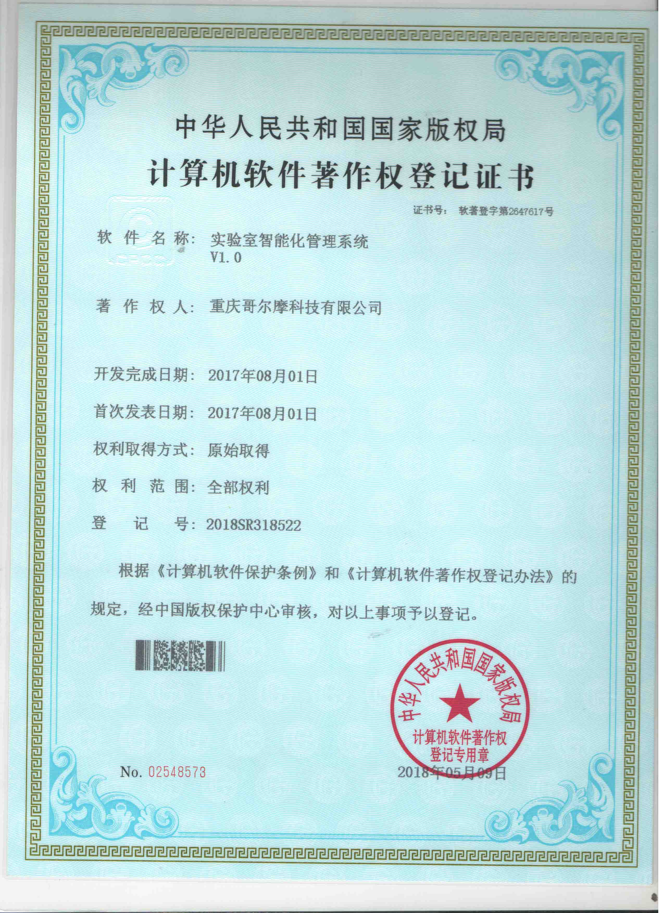 熱烈祝賀我公司獲得計(jì)算機(jī)軟件著作權(quán)登記證書!